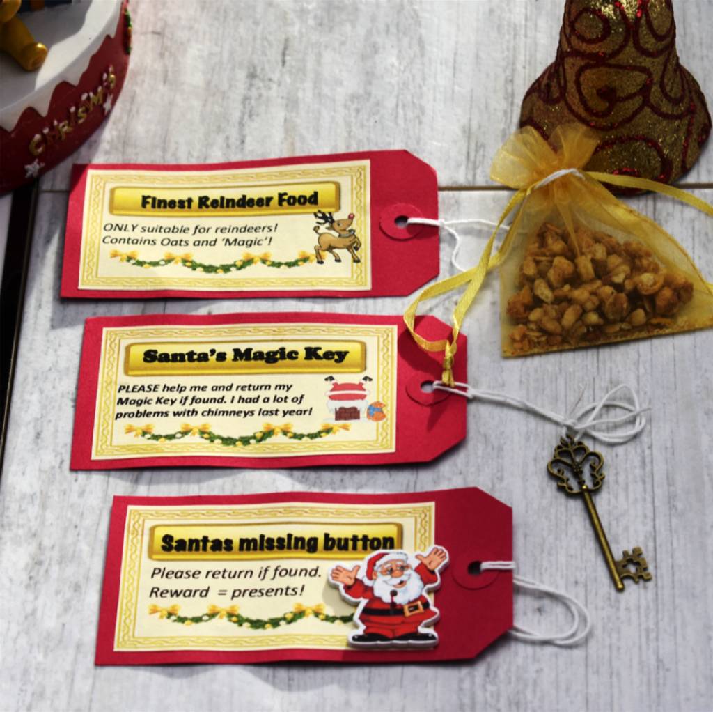 Contents of Christmas Eve box Christmas book, pjs, Christmas hats, DVD, candle, reindeer dust