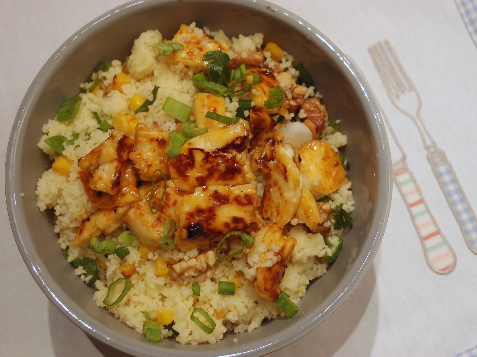 Put the couscous in a large heatproof bowl. Pour over the hot vegetable stock or water, stir and cover the bowl with a clean towel and leave for 10 minutes. Fluff with a fork and set aside until ready to serve. Slice the halloumi into 6 thick pieces. Heat a frying pan over a medium heat with a drizzle of oil.