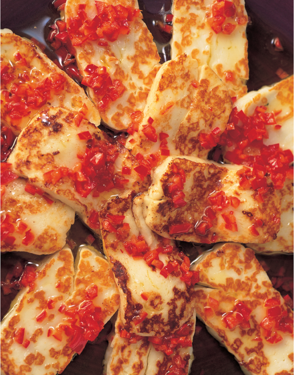 Method. Mix the chopped chilli and olive oil in a small bowl or cup and leave the flavours to deepen while you cook the cheese. I use a non-stick frying pan for this, without any oil, and just give the cheese slices about 2 minutes a side until they're golden-brown in parts. When all the slices of halloumi are cooked, transfer them to a couple.