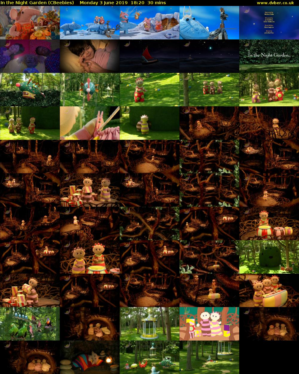 In the Night Garden: 2019-03-16-1820: Forum: In the Night Garden. CBeebies Saturday 16 March 2019 18:20 - 18:50 (30 mins) 58/100. In a magical forest, colourful characters have adventures and are read stories. Everything in the garden is so noisy that Igglepiggle finds a quiet place. [S] Dvber 2024.