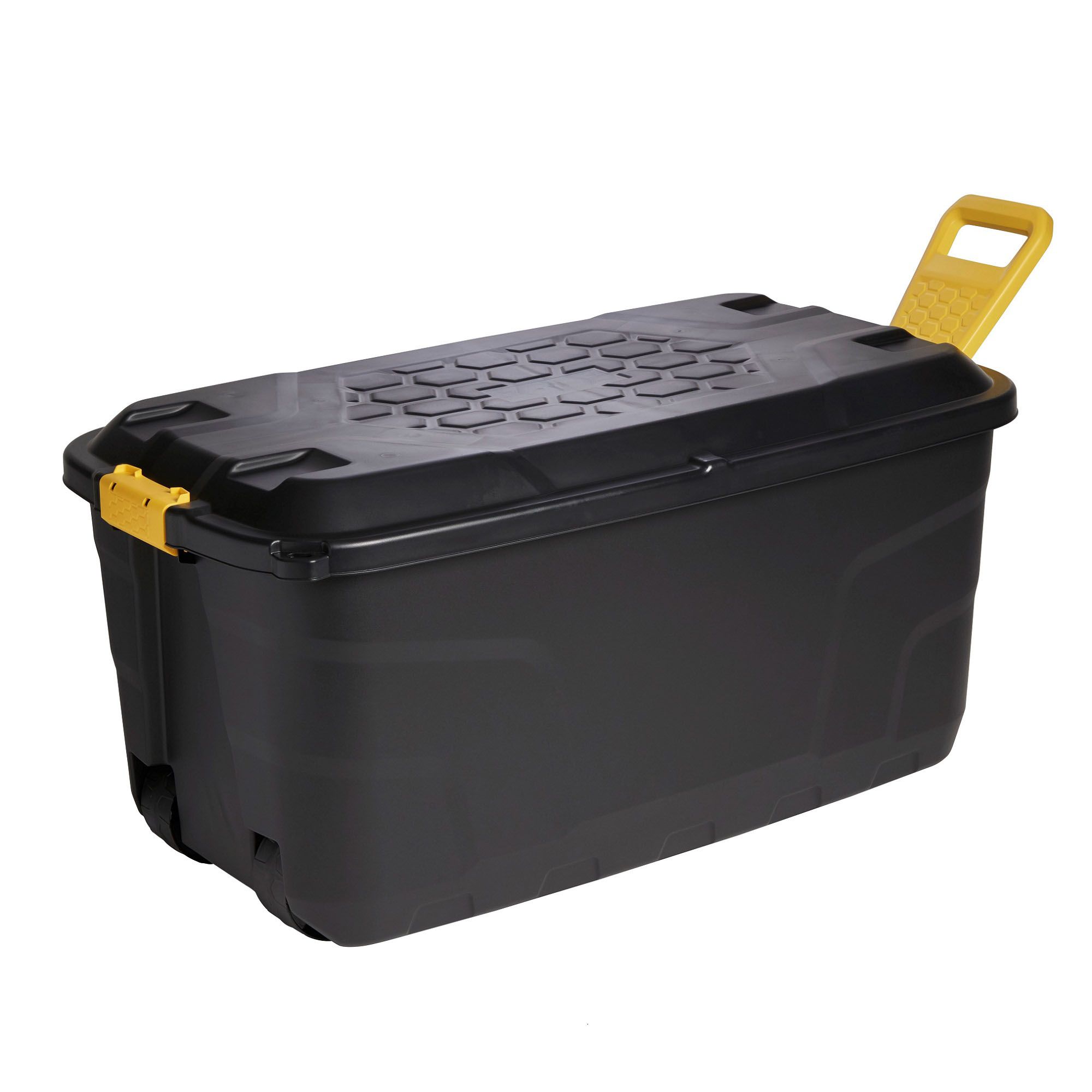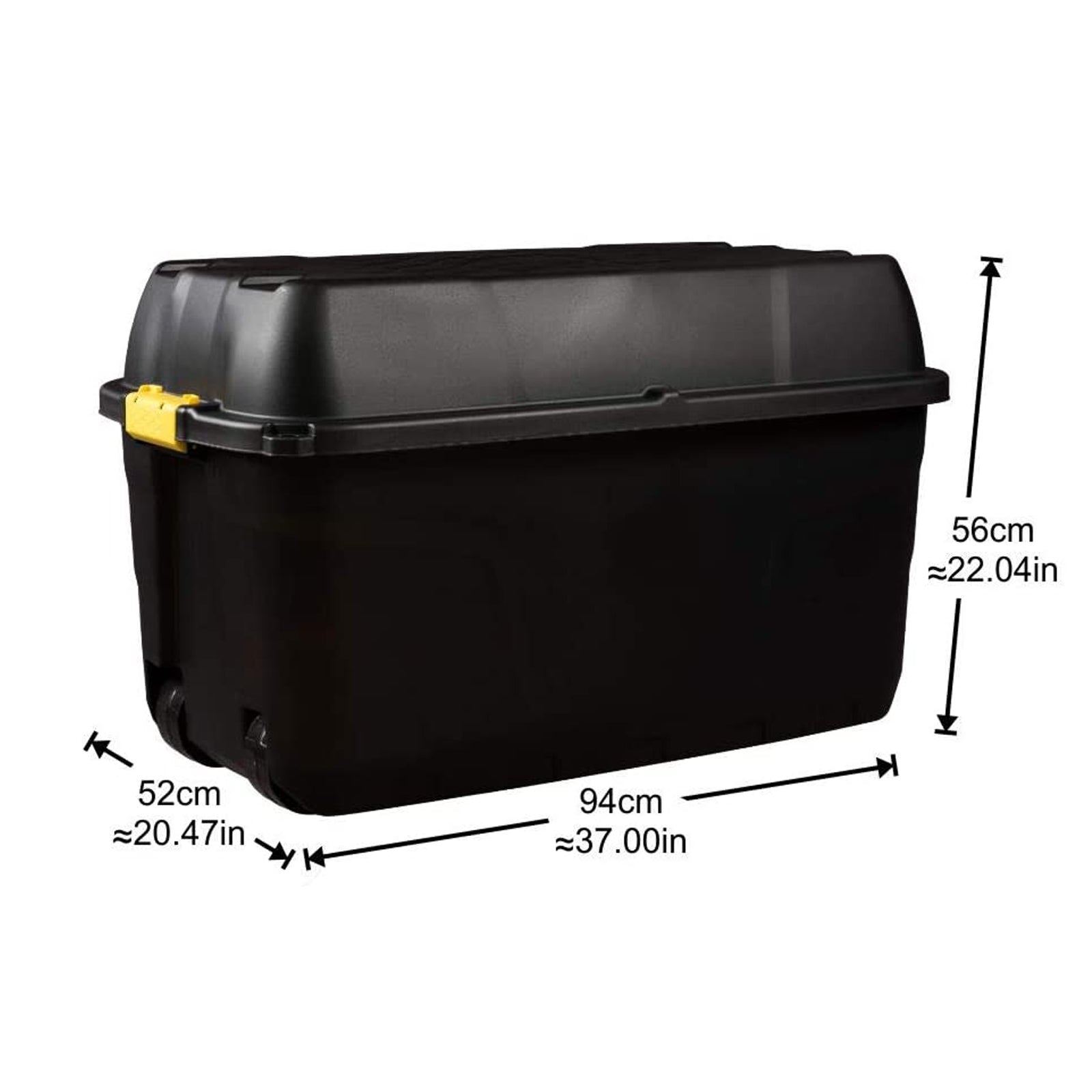Strata Heavy Duty Storage Case with Lid and Wheels 110 Litres, 77 x 42 x 54 cm - Black. 4.6 out of 5 stars 77. 7 offers from £26.49. Charles Bentley 2 x 175L Heavy Duty Trunk on Wheels- Black H56 x L94 x W52cm 5.2kg Strong clip locks waterproof design Indoor/Outdoor.