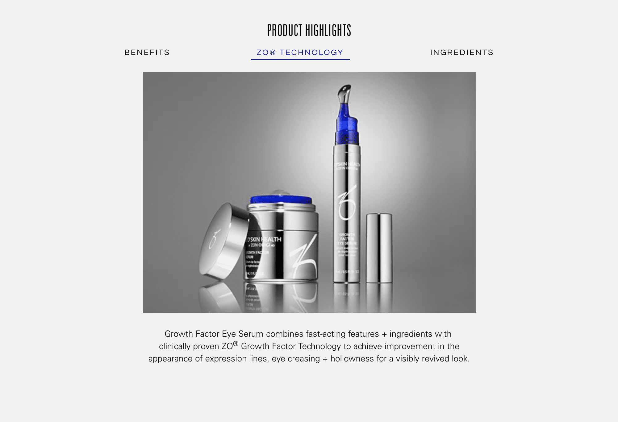 Shop Growth Factor Eye Serum at ZO® Skin Health. Skip to Content (Press Enter) Skip to Footer (Press Enter) FREE GROUND SHIPPING ON ALL ORDERS FOR A LIMITED TIME ONLY* Show navigation. Choose My Clinic Sign In / Create an Account Shop.